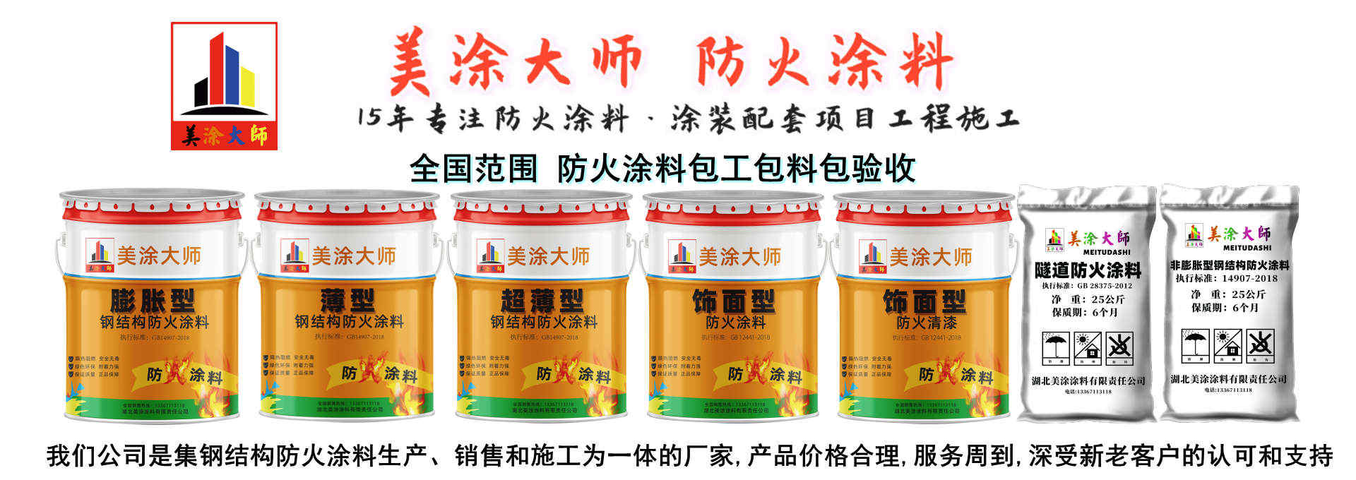 湖北美涂涂料有限责任公司——公司产品包涵了建筑涂料、防火涂料、防腐涂料、工业涂料、地坪涂料、防水涂料等系列产品,是一家专注从事油漆涂料研发、生产、销售、施工与售后于一体的生产型环保企业。隧道防火涂料施工,厂房防火涂料工程,钢结构防火涂料施工包工包料包验收 我们公司主要从事防火涂料施工,防火涂料工程,钢结构防火涂料施工,钢结构防火涂料工程,钢结构防火漆施工,包括外墙涂料翻新,地坪漆施工,防火涂料施工等。主要服务区域河北省、山东省、辽宁省、黑龙江省、吉林省、甘肃省、青海省、河南省、江苏省、湖北省、湖南省、江西省、浙江省、广东省、云南省、福建省、台湾省、海南省、山西省、四川省、陕西省、贵州省、安徽省以及全国为主。湖北美涂涂料有限责任公司是全国涂装市场少有的坚持、继承、发扬工匠精神的专业防火防腐施工团队,致力于防火防腐涂料工程施工历经15年岁月。